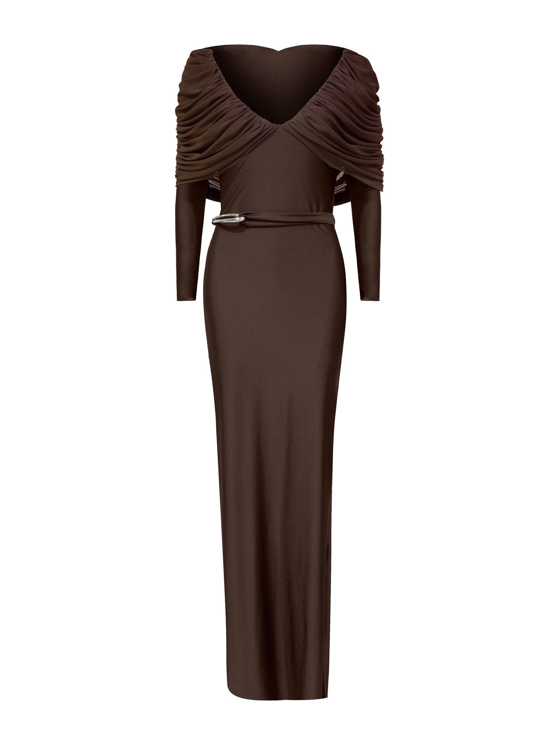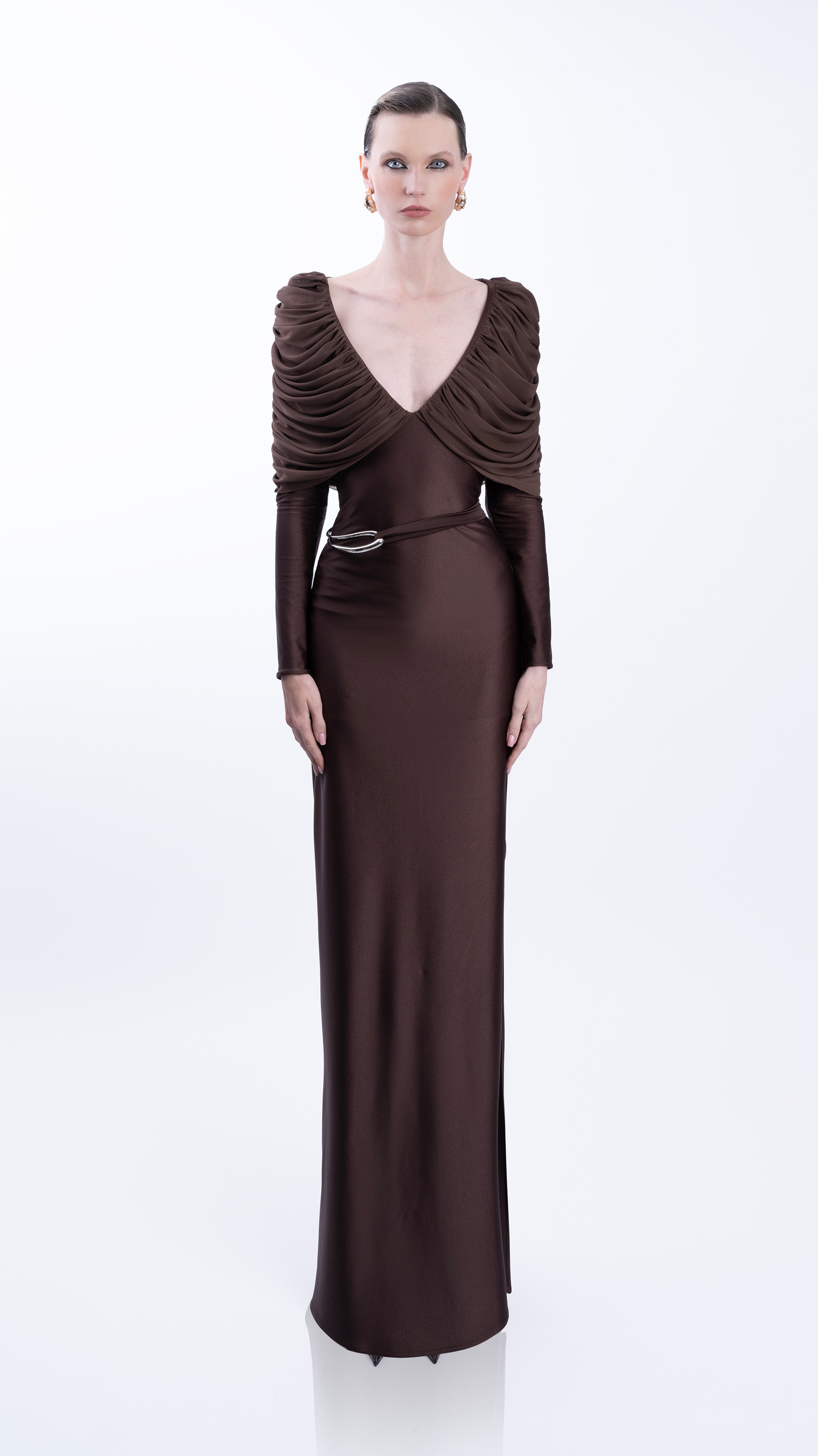 Vestido largo de escote en V, con drapeado en el busto y mangas largas ajustadas. Presenta silueta recta y detalle de herraje en la cintura que define la figura con un acento sutil. Un diseño elegante y preciso, ideal para eventos especiales.