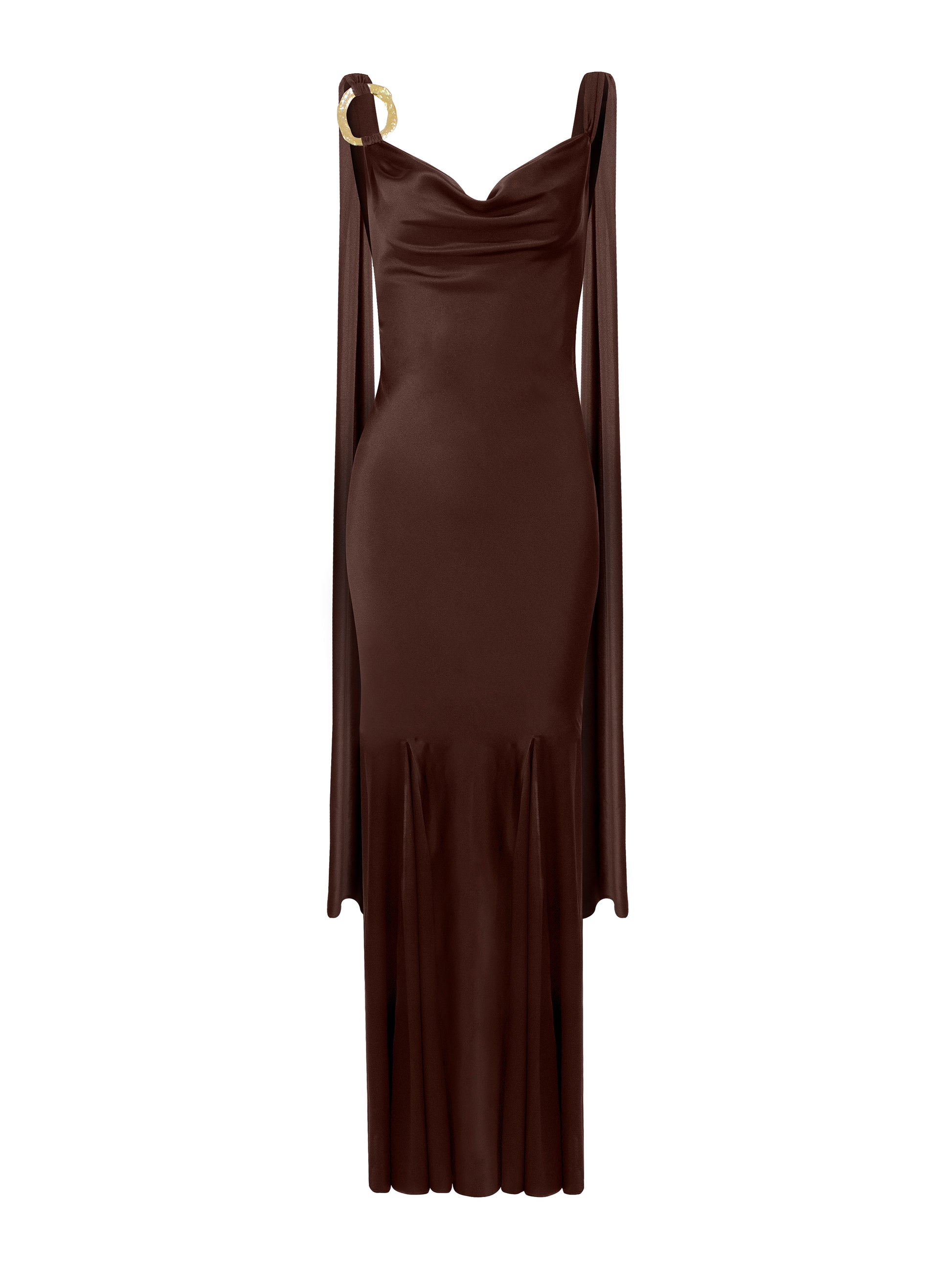 Vestido largo de silueta ajustada, confeccionado en seda que se adapta al cuerpo con una caída fluida y elegante. Tiene un escote drapeado suave y tirantes delicados, uno de ellos con detalle de herraje metálico que aporta un acento sofisticado y distintivo.