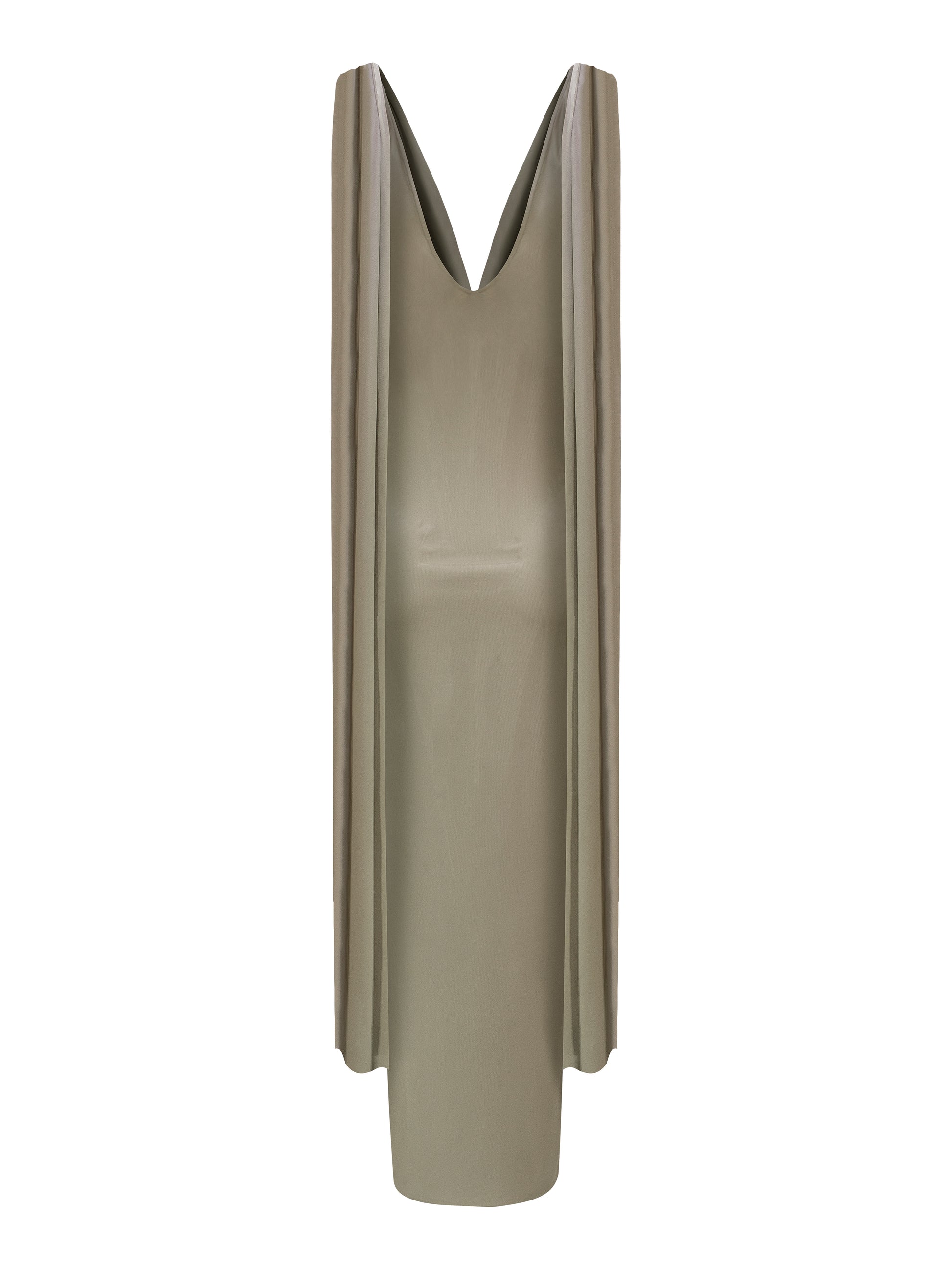 Vestido largo de silueta ajustada, confeccionado en tejido elastico que se adapta al cuerpo. Presenta escote profundo en V y drapeado cruzado en la cadera que estiliza la figura, acompañado de estolas largas colgantes en la espalda que aportan movimiento y un efecto sofisticado al caminar.
