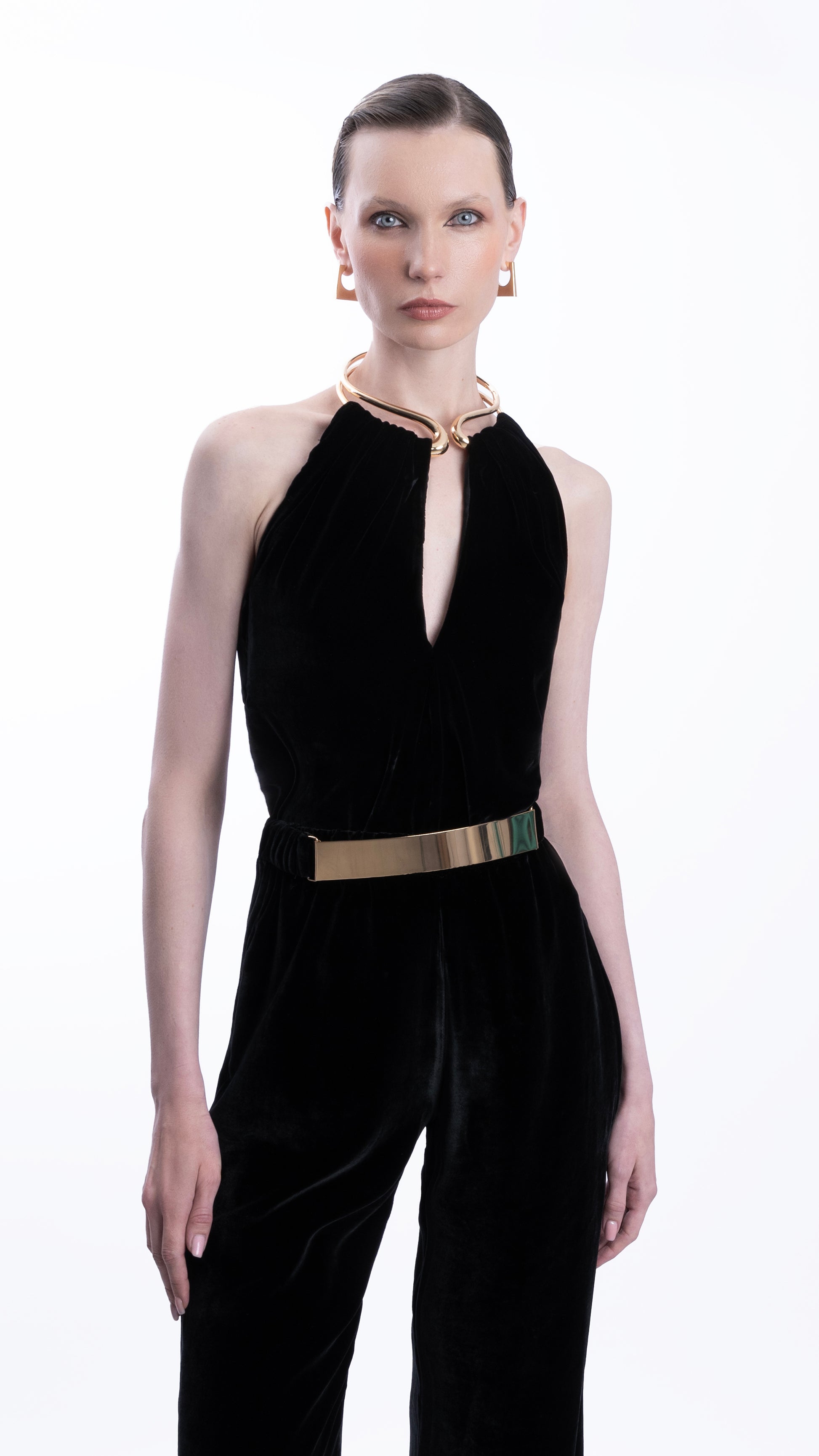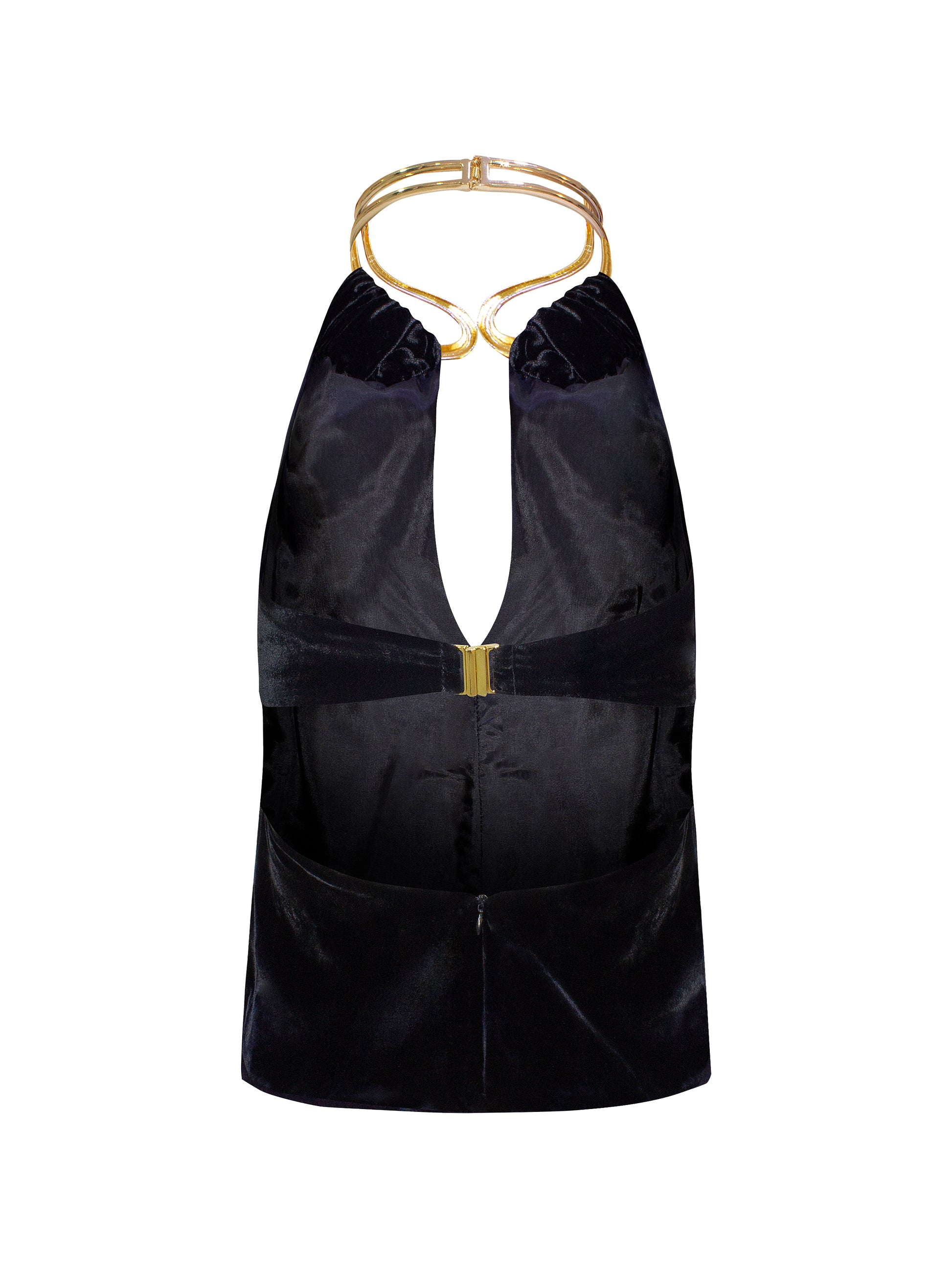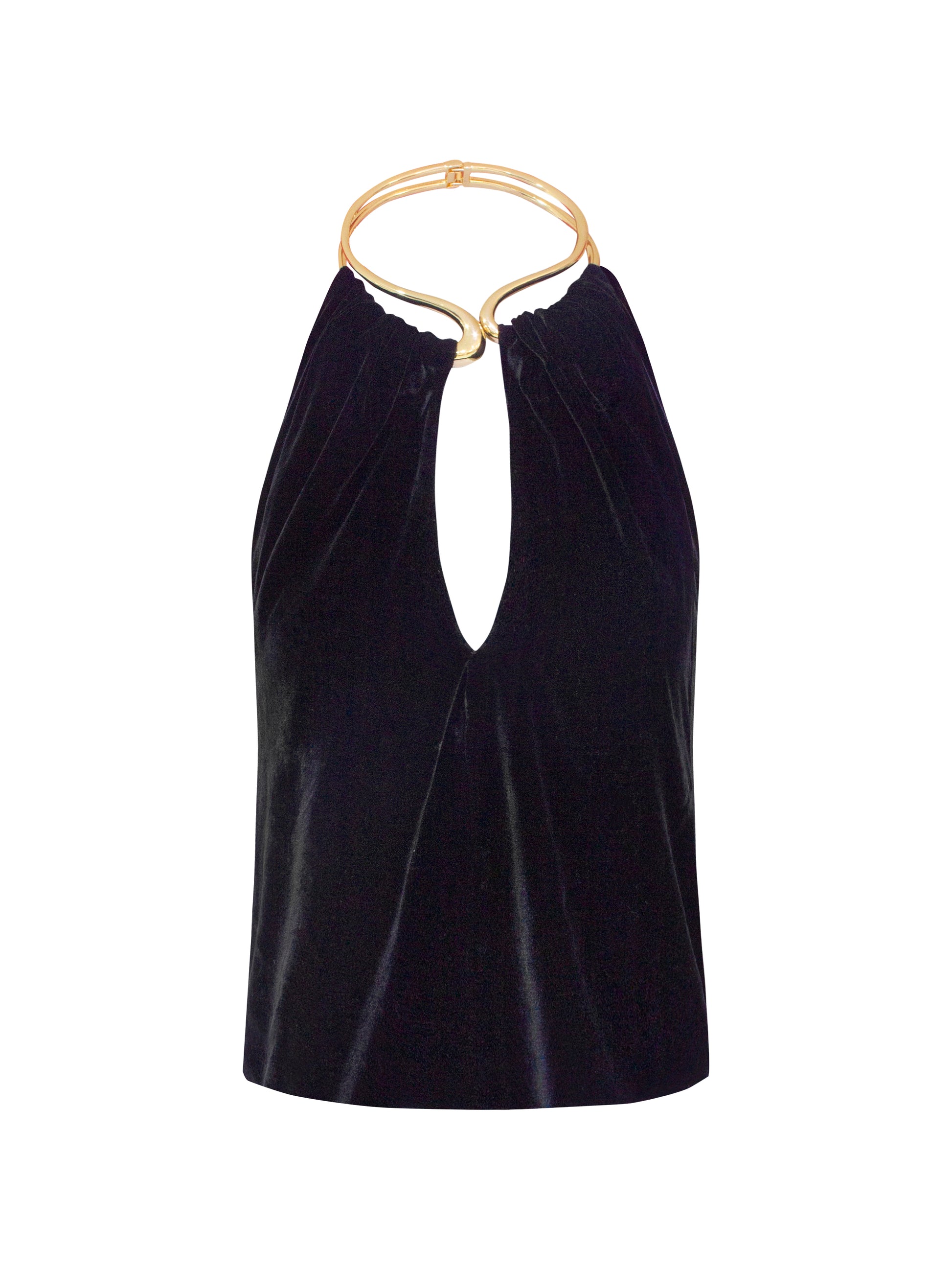 Top de silueta halter, confeccionado en terciopelo de seda que aporta una textura suave y un acabado sofisticado. Presenta escote profundo con caída elegante al frente y un diseño minimal que realza el cuello y los hombros con sutileza.