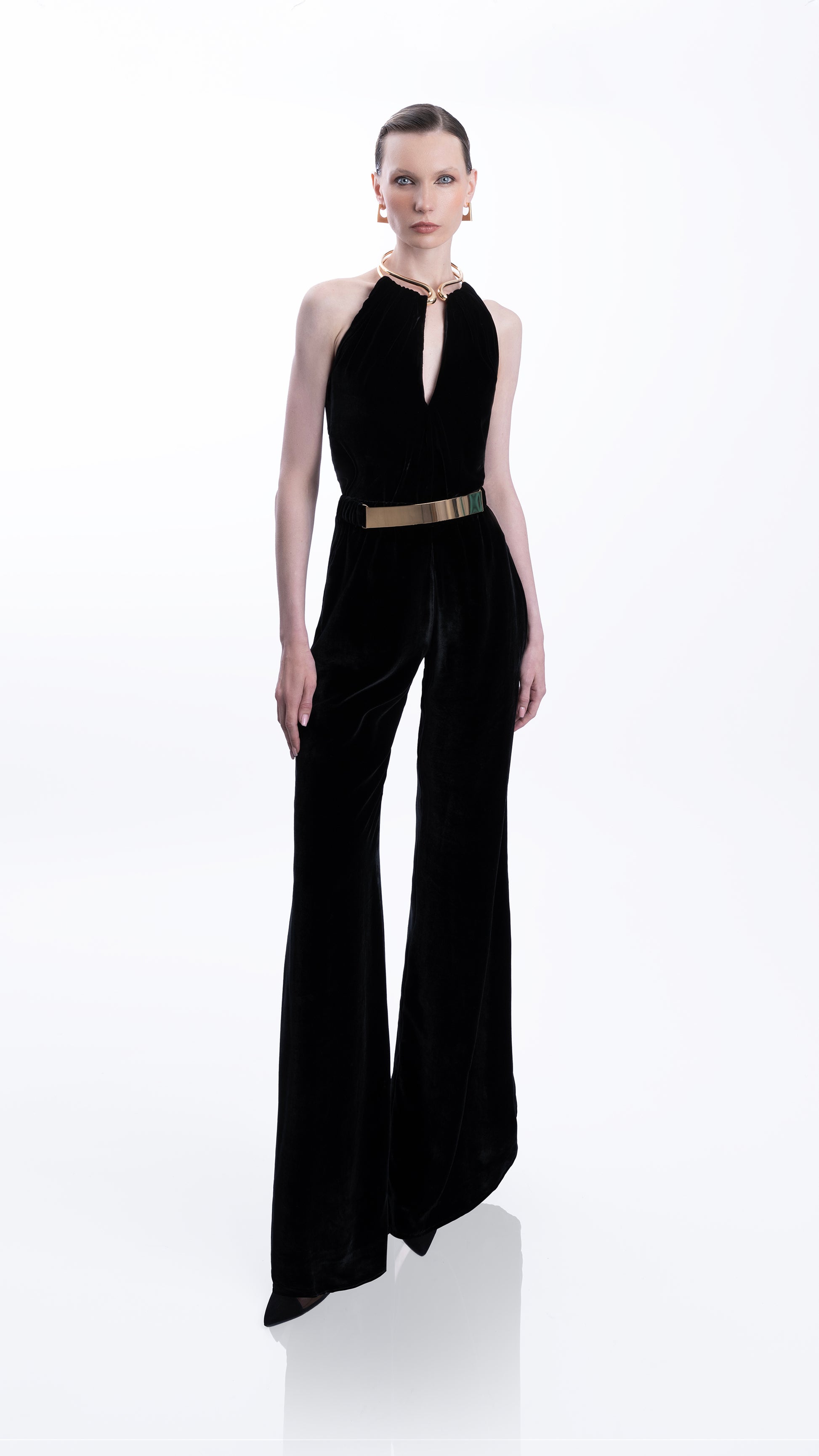 Pantalón de silueta recta y caída fluida, confeccionado en terciopelo de seda que aporta un acabado suave y sofisticado. Su diseño de tiro alto estiliza la figura, mientras el detalle de herraje metálico con baño en oro de 24k en la pretina añade un acento lujoso y contemporáneo.