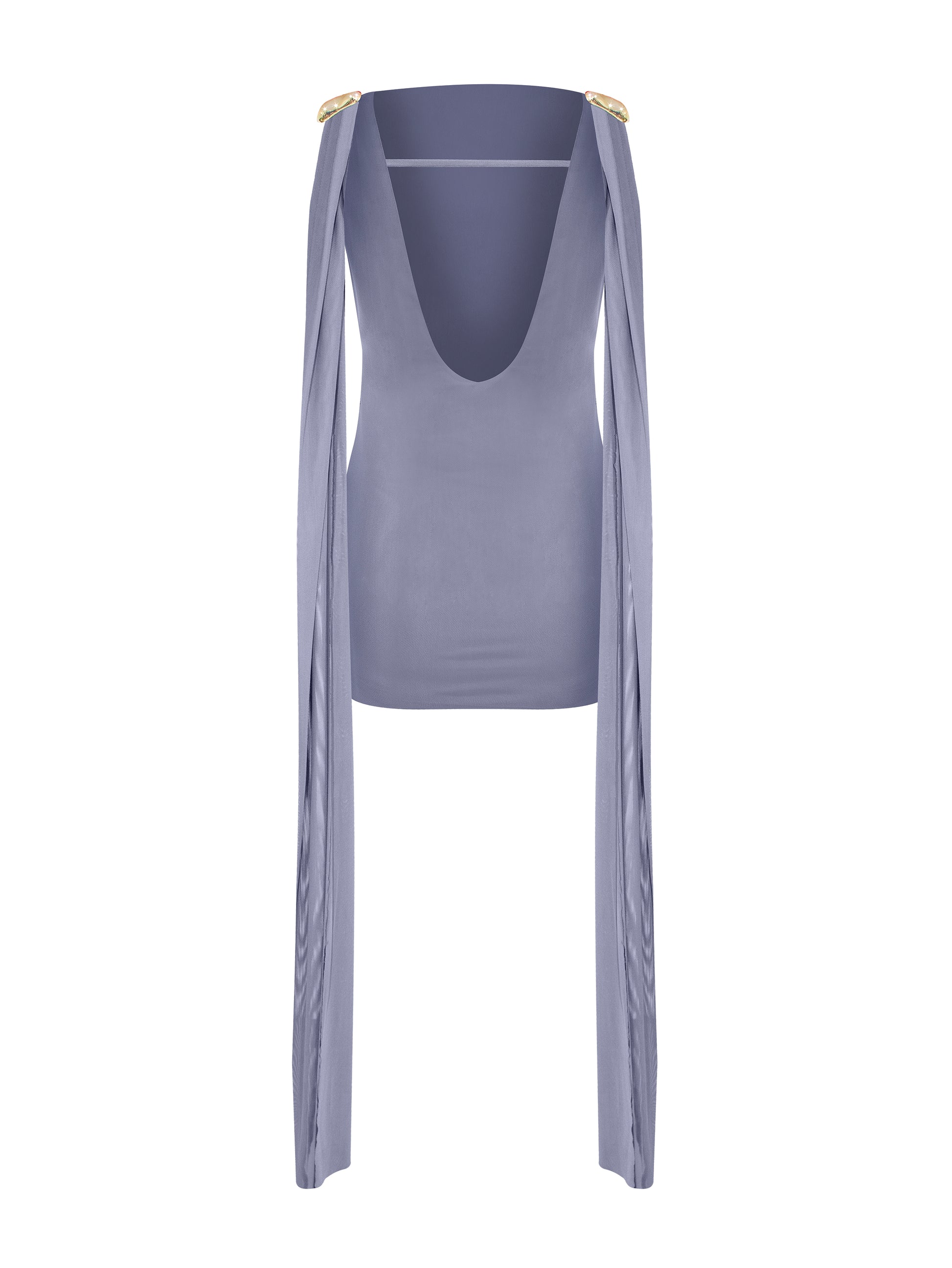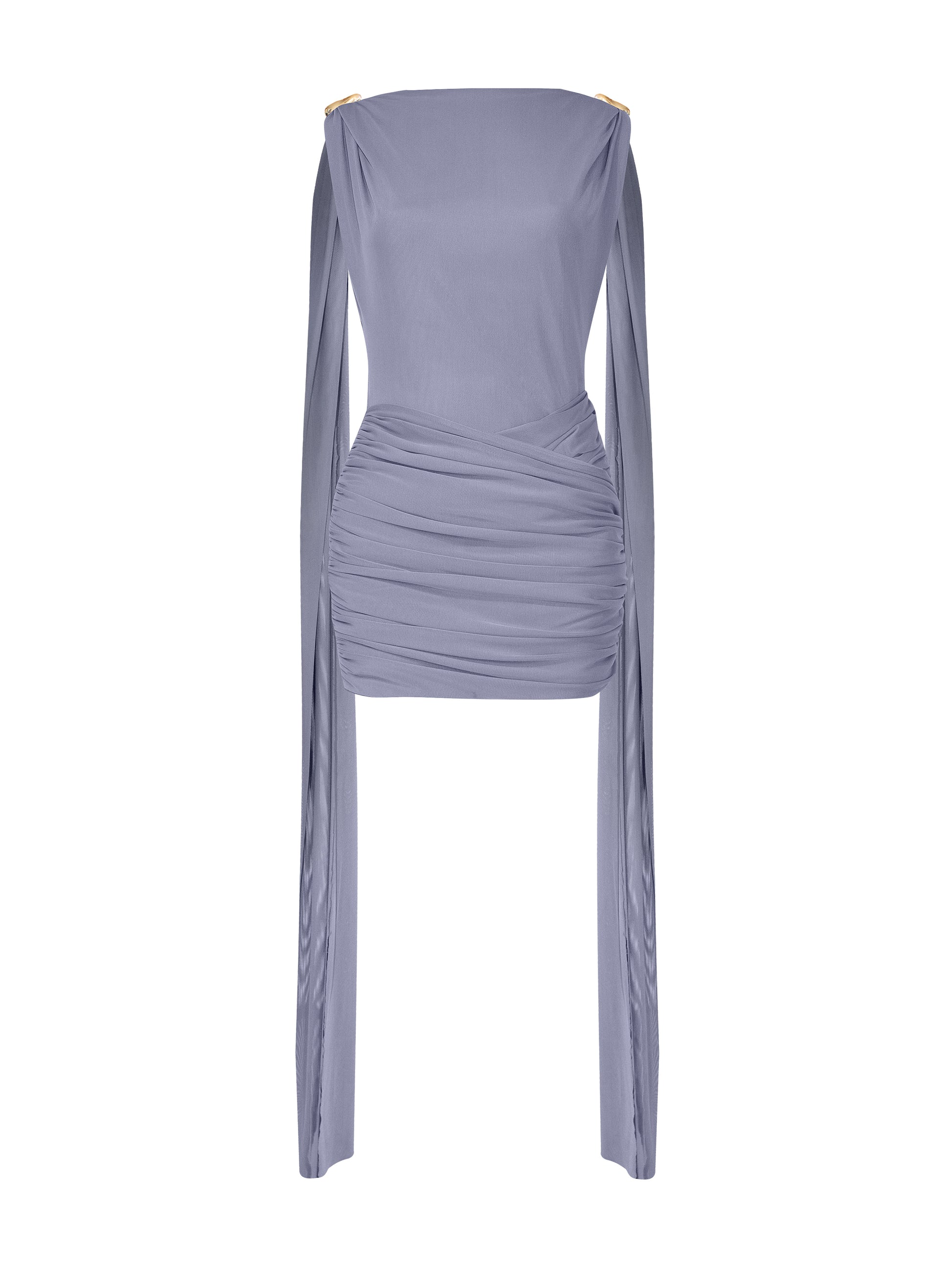 Vestido mini drapeado de silueta ajustada, diseñado para realzar la figura con un efecto envolvente sofisticado. Presenta escote asimétrico y frunces estratégicos que aportan textura y movimiento, complementados por paneles fluidos laterales que elevan el diseño con un aire etéreo y moderno. Una pieza femenina y poderosa, ideal para eventos nocturnos y ocasiones especiales.