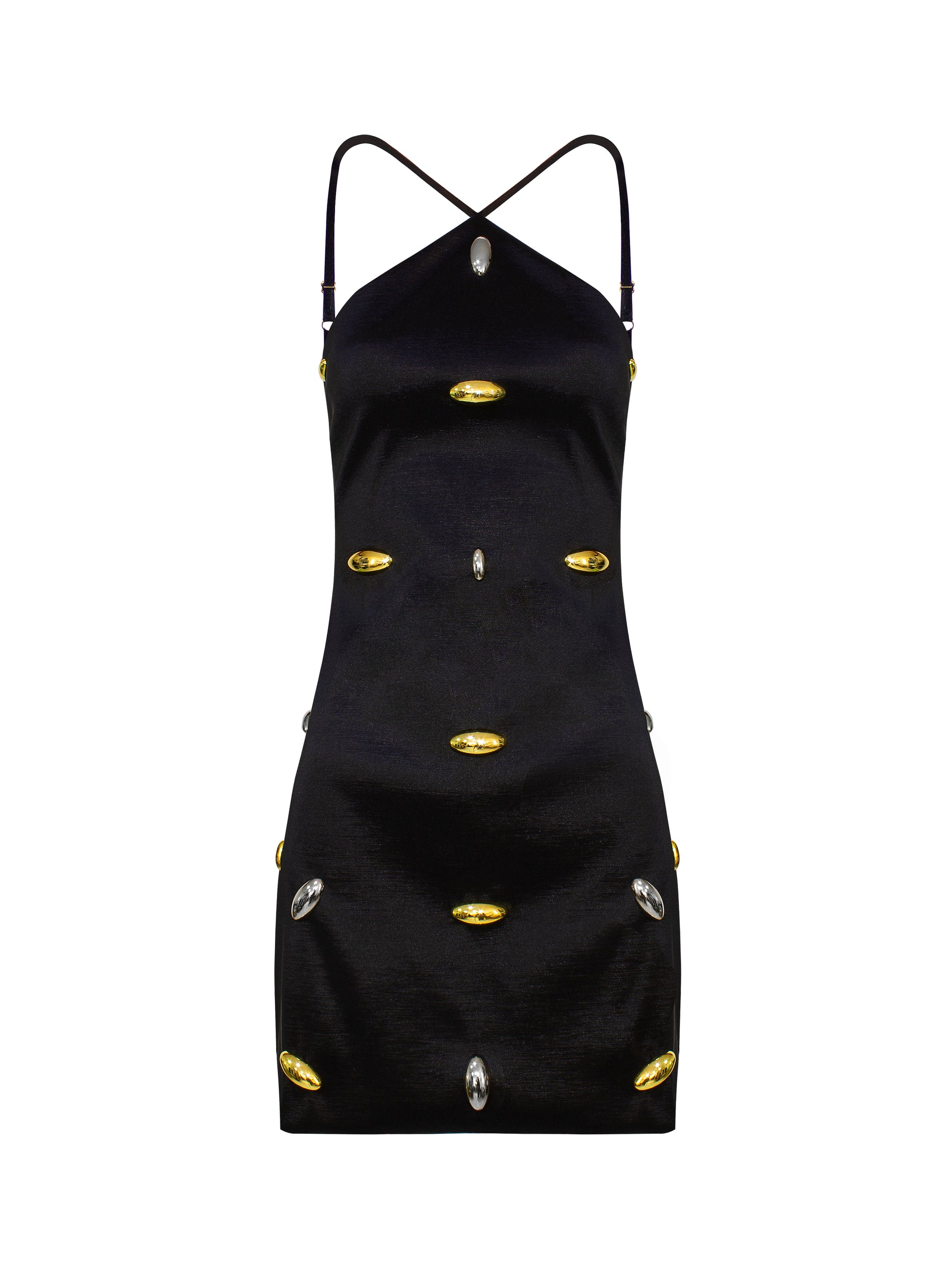 Vestido mini de silueta ajustada, confeccionado en tafetán satinado y completamente forrado en tafetán para un fit estructurado y cómodo. Presenta escote halter con tirantes finos ajustables y aplicaciones metálicas doradas que aportan un acento joya sofisticado. Una pieza elegante y audaz, ideal para noches y eventos especiales.